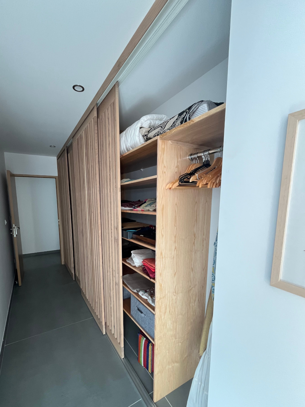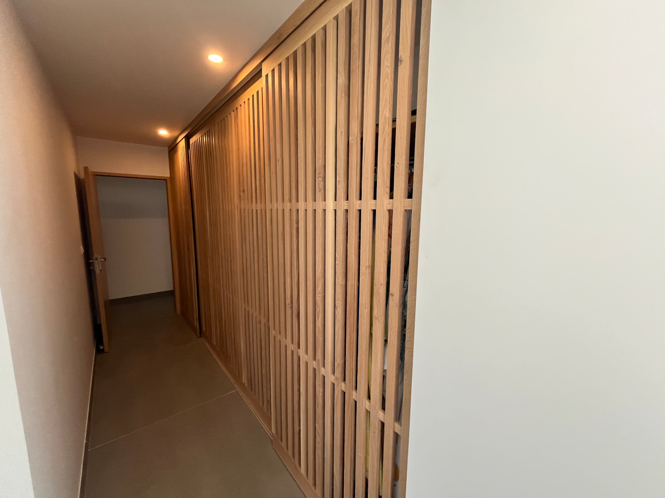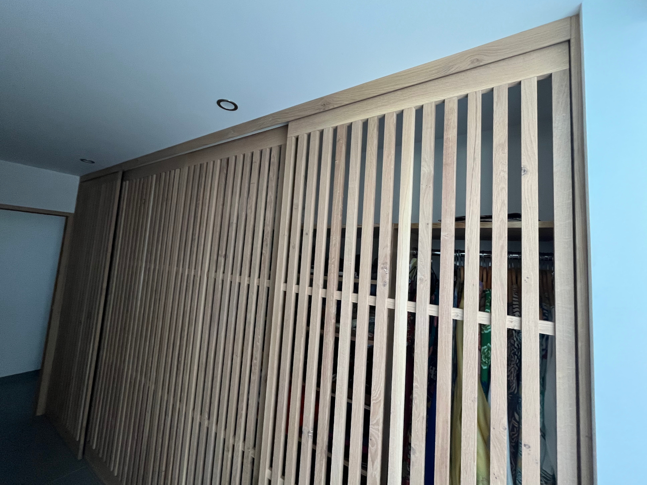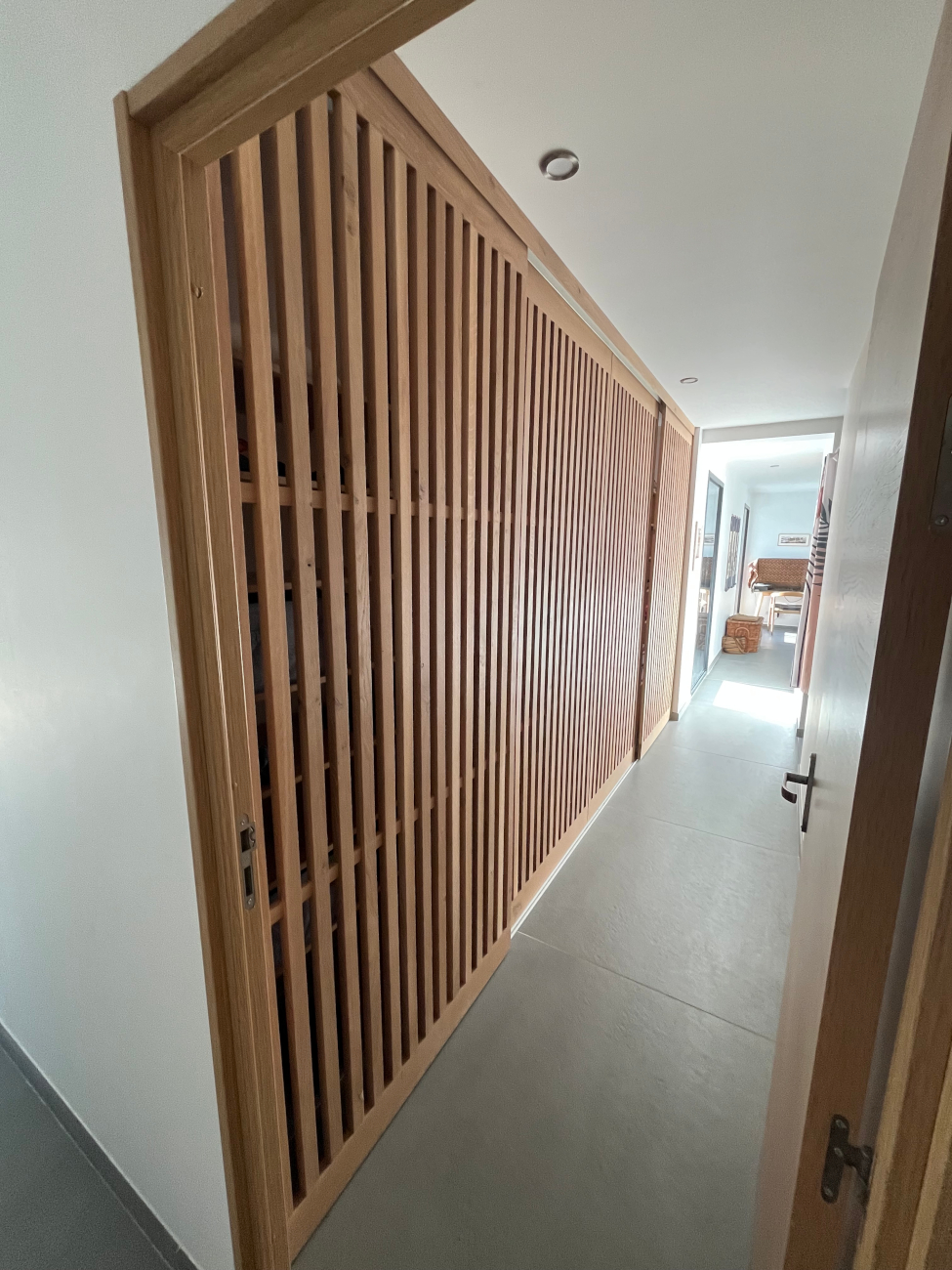 Dans cette maison, après avoir transformé la cuisine et conçu les caches techniques assortis, nous avons poursuivi le projet dans le couloir, avec la création de quatre portes coulissantes en claustras de chêne massif.