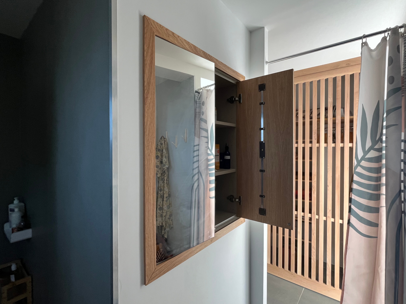 Nous avons également réalisé deux portes miroir sur mesure, composées d’un cadre en chêne massif et d’un miroir plein, afin d’agrandir visuellement la pièce et d’apporter davantage de lumière naturelle.