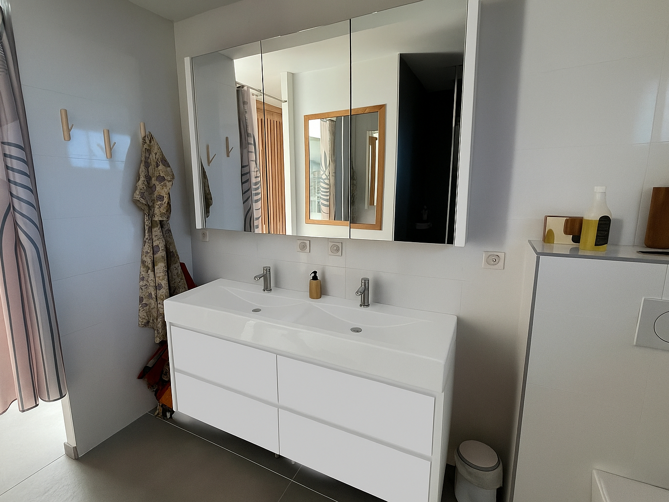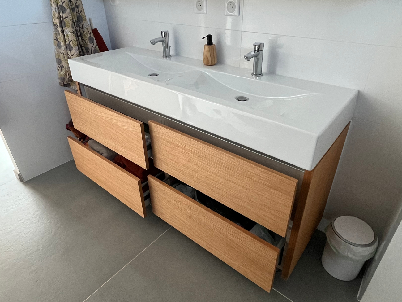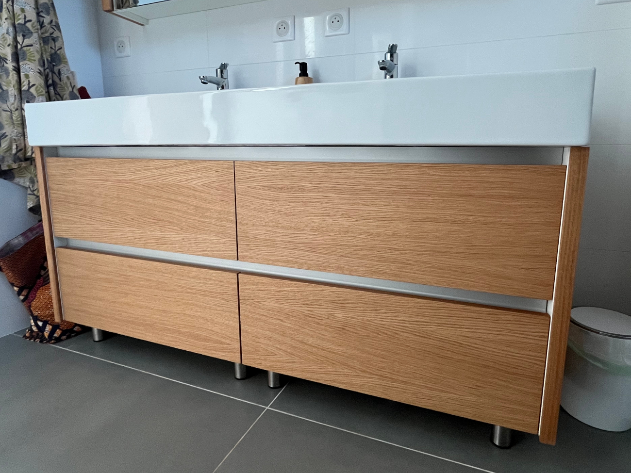 Le travail a commencé par le relooking du meuble de salle de bain existant, modernisé grâce à l’ajout de chêne sur les côtés et les façades de tiroirs. Ensuite les encadrements du miroir blancs ont aussi été habillés de chêne.